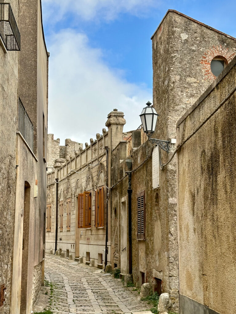Erice is een Middeleeuws bergdorpje. Het ligt boven op een steile berg, de Monte San Giuliano, in het noordwesten van Sicilië. Het leuke van het dorpje is natuurlijk dat het nog zo authentiek is. Er is sinds de Middeleeuwen weinig veranderd. Logisch, want vol is vol, en de bergtop is redelijk compact vol gebouwd. Het gevolg is dat er nog allemaal kleine straatjes zijn, en er gelukkig niets moderns te vinden is. Er zijn ook verschillende kerken, mooie pandjes, een kasteel en leuke doorkijkjes. Omdat de berg zo’n 750 meter hoog is, heb je ook een fantastisch uitzicht over de omgeving….als het mooi weer is tenminste.